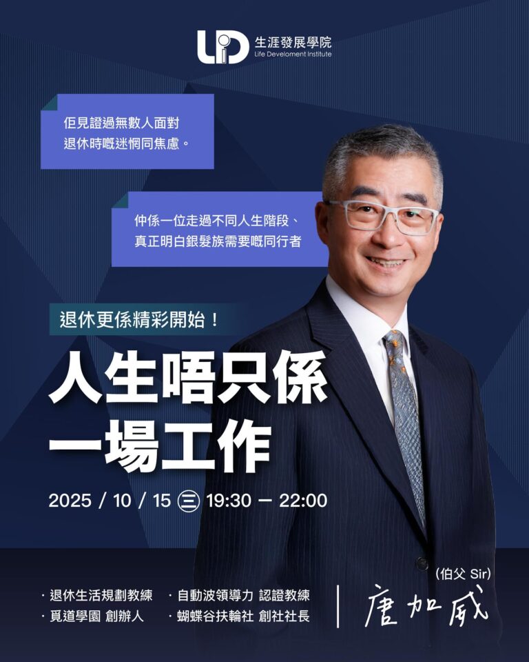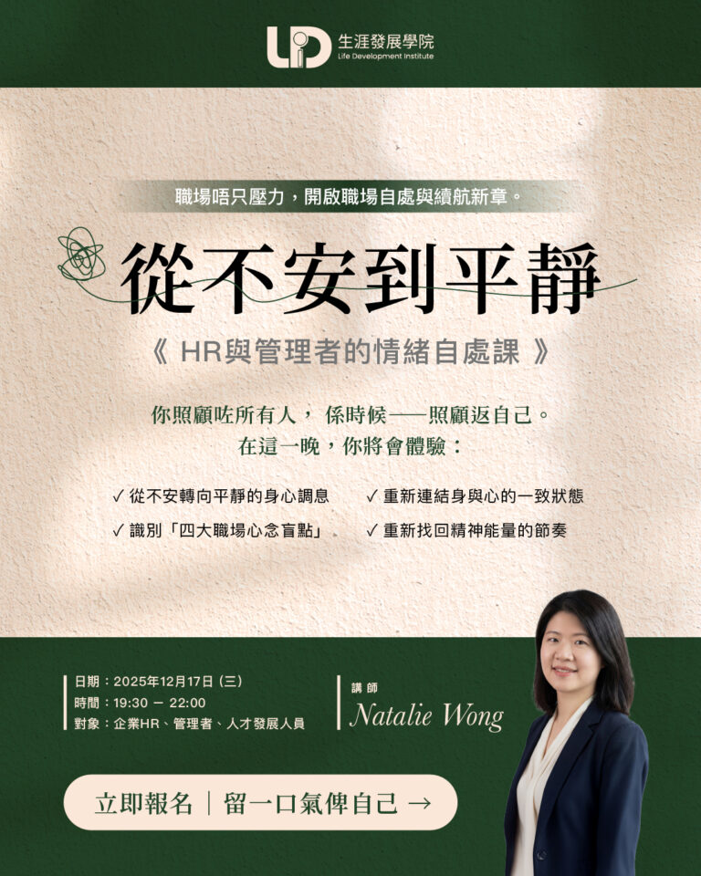 生涯 123 探索工作坊 Life Planning Exploration Workshop 生涯不只是職涯,它涵蓋我們的價值觀、興趣、關係與生活方式。工作坊包含多元生涯探索主題和體驗,讓你從日常生活中找到新方向、探索更多可能性,掌握有效的生涯工具與資源,包含理論、諮詢技術、評測工具等帶來的新觀點,引導不同生涯階段的朋友了解自己、發掘潛能,規劃更幸福充實的人生。 報名工作坊 報名免費線上說明會 服務逾 位師生 0 K+ 合作單位逾 政府、企業、學校、社福機構 0 + 每年舉辦近 場生涯規劃課程 0 + 每月工作坊主題 10月 報名工作坊 伯父秘籍 進優之道 退休唔等於收山:開展人生下半場 退休唔代表人生「game over」!其實,呢一刻先係你人生嘅「第二幕」。 重新搵返自己嘅價值同方向 培養新興趣,活出精彩 學習新技能,保持腦筋靈活 今次工作坊會同大家一齊傾、一齊玩,幫你探索退休後嘅生活新可能。 日期:2025年10月15日 (三) 時間:19:30 – 22:00 對象:準備退休、剛退休、已退休嘅你 一齊嚟,發掘下半場人生可以點樣活得更有意義! 12月 報名工作坊 生涯適應力: HR / 管理者的自處心靈守護術 此工作坊針對HR從業員自處適應力而設,賦能HR Pro /管理者「從不安到平靜的自我開脫能力」,以四大心念應對職場處境痛點, 學習精神能量的健康秘訣,情緒掌控與思想規條的課題。這是HR Pro #通用技能 #自我關懷 #職場自處 的必修課。 [課程資訊] 生涯適應力: HR / 管理者的自處心靈守護術 | 生涯123探索工作坊 📅 2025 年 12 月 17 日(三) 時間︰19:30 – 22:00 語言:廣東話 費用:$160/人 實體地點:九龍觀塘偉業街161號, The 80|20 9樓905室 活動時數均可換算為國際生涯發展學會 (NCDA) 繼續教育學分 (CEP) 請立即加入我們的會員計劃 成為「生涯導航會員計劃」每年4次「生涯123探索工作坊」優先參與機會 我要了解會員計劃 能學到什麼 生涯多元發展與個人成長 涵蓋不同主題,探索職涯、親密關係、時間管理、心理韌性等關鍵議題淺嘗生涯規劃,深入剖析個人價值觀、興趣與能力,找到適合自己的生涯道路 掌握高效生涯工具與資源 學習熱門的生涯規劃技術,強化人生不同階段的決策與問題解決能力透過多種生涯工具及技術,建立清晰的行動計劃 建立個人化的生涯策略 根據自身優勢,從生活中發現生涯發展的可能性,學會如何適應社會變遷與挑戰開拓生涯規劃的新視野,規劃未來發展路徑,提升職涯滿足感與幸福感 滿足持續學習與專業發展需要 提供最新生涯資源,助力個人與職業發展獲取國際認證持續學習學分,增強競爭力 為什麼選擇我們 涵蓋多元生涯領域 ✔ 探討工作、財務、心理韌性、關係、職涯轉型等實用議題✔ 不論你是探索自身發展,還是希望助人,都能找到適合的方向 高品質生涯導師與資源支持 ✔ 由國際生涯發展總教練 (CDM) 及國際生涯發展培訓師 (CDI) 親授✔ 提供最新的生涯發展工具與評估資源,助你持續成長 豐富互動體驗與個案演練 ✔ 「一個課程,三種學習體驗」:應用學習、互動工具、個案研討✔ 實戰操作生涯工具,提升應用技巧 報名:生涯123探索工作坊 正在載入… 常見問題 生涯發展對我有什麼幫助? 在VUCA的年代,我們的生涯不是單純靠努力讀書、工作、賺錢,就能夠應付世間的變化,滿足我們的夢想,實現我們的人生。生涯發展是應變之學,讓我們能夠發掘天賦與內在優勢動能,適應外間環境的變動,在實現理想人生的前題下,調節和選擇合適我們的目標與行動,使我們在人生不同階段、不同角色間都能夠有清晰的計劃,協助我們提升工作、家庭、關係、心靈、成長等各個生涯範疇的滿意度,獲取幸福、美滿的人生。 生涯發展諮詢與一般心理輔導有什麼分別?是有問題才需要嗎? 不少人認為有問題才需要找諮詢輔導協助,但這已是過往的想法。其實只要你想更清晰自己的困擾成因、現況和未來,就可以找專業人士的協助。生涯發展諮詢相對心理輔導,不是聚焦解決個人的心理健康問題,而是著重將個人內在特質與外在環境條件作綜合分析,支持受助者按個人的想法,整理出生涯與事業的發展道路和目標,應對多元挑戰,解決困擾和問題,促進人生和事業成長和滿足。 我應該選擇「助己」還是「助人」的課程? 因為生涯發展涵蓋我們人生所有階段,所以無論你是想「助己」還是「助人」,所有人都適合學習生涯發展。我們建議,若你想在轉職、求學、組織家庭等人生階段轉換時期,計劃更明確的人生前路,或應對現時面對的困擾和挑戰,可以選擇「助己」的課程;若你認為自己有一定的能力,可以在「助己」的過程中同時「助人」,在原來的行業上更有效支持同事、客戶、對象的。